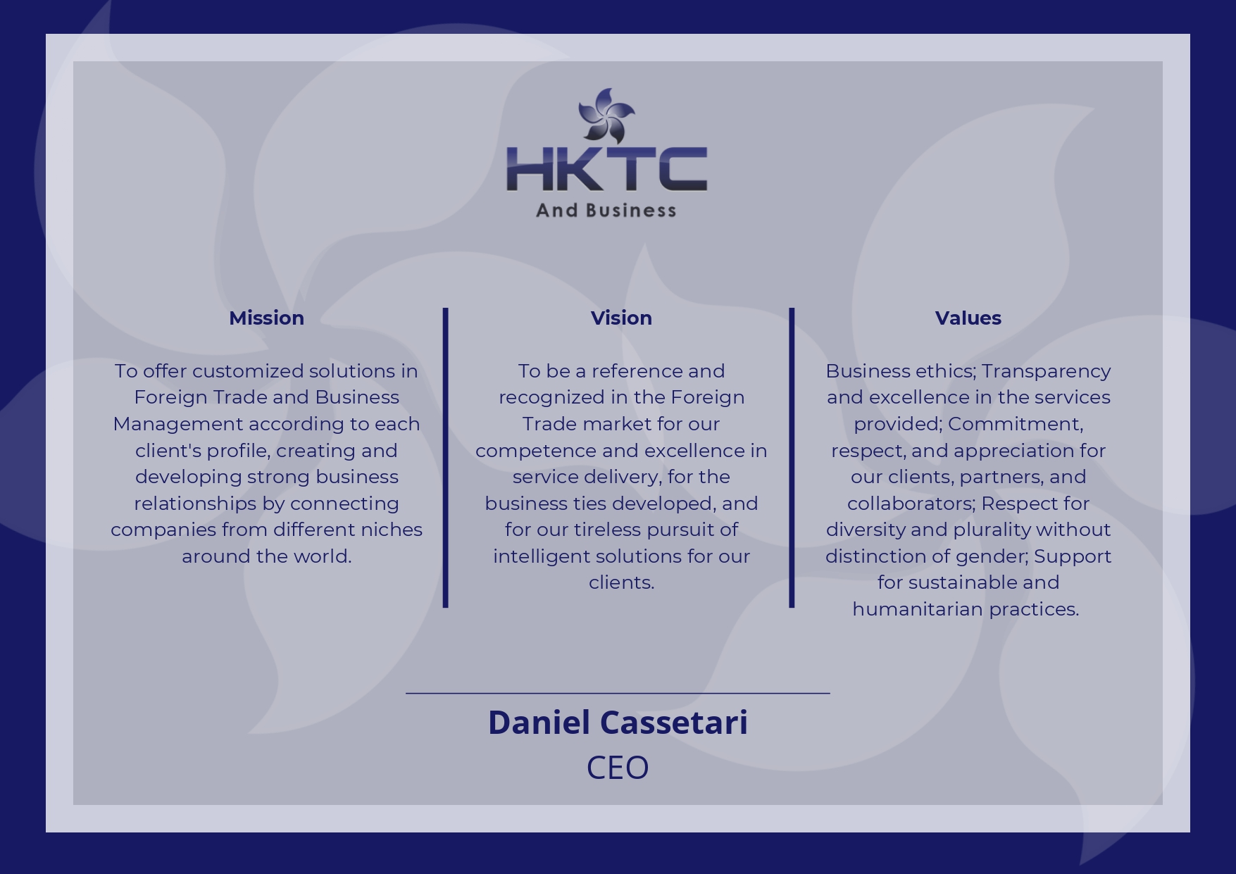 HKTC and Business operates with responsibility and transparency, always focusing on qualification, excellence, and the continuous improvement of its services. We are committed to earning our clients’ trust by positioning ourselves as true business partners — delivering quality, accountability, and efficiency in everything we do. Our values combine transparency, ethics, sound corporate governance, respect for human labor, a constant pursuit of knowledge and qualification, and, of course, continuous improvement and growth.