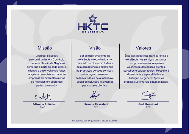 A HKTC atua de forma transparente e responsável, sempre mantendo o foco em qualificação, excelência e melhoria contínua dos serviços. Buscamos sempre a confiança de nossos clientes, nos colocando como verdadeiros parceiros de negócios, através da qualidade, responsabilidade e eficácia de nossos serviços. Nossos valores conversam entre a transparência, ética, organização corporativa saudável, valorização do trabalho humano, busca constante de conhecimento e qualificação e, claro, melhora e crescimento contínuo.