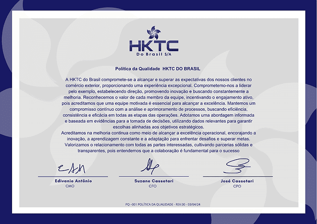 Antes de consolidar sua presença no setor de comércio exterior e ser conhecida por sua atuação estratégica e excelência operacional, a HKTC and Business criou raízes em Hong Kong, um dos maiores centros logísticos e financeiros do mundo, reconhecido pela sua vocação e dinamismo para relações e trocas internacionais. Com o objetivo de garantir eficiência e precisão logística a suas operações, a empresa expandiu seus horizontes até a China. Com duas filiais, situadas em Guangzhou e Yiwu, que cuidam do controle administrativo e das demandas logísticas, respectivamente, a HKTC se firmou no mercado internacional. Idealizada com o propósito de conectar mercados e criar oportunidades, a HKTC nasceu com uma visão objetiva: transformar o comércio exterior em um processo mais eficiente, transparente e seguro.